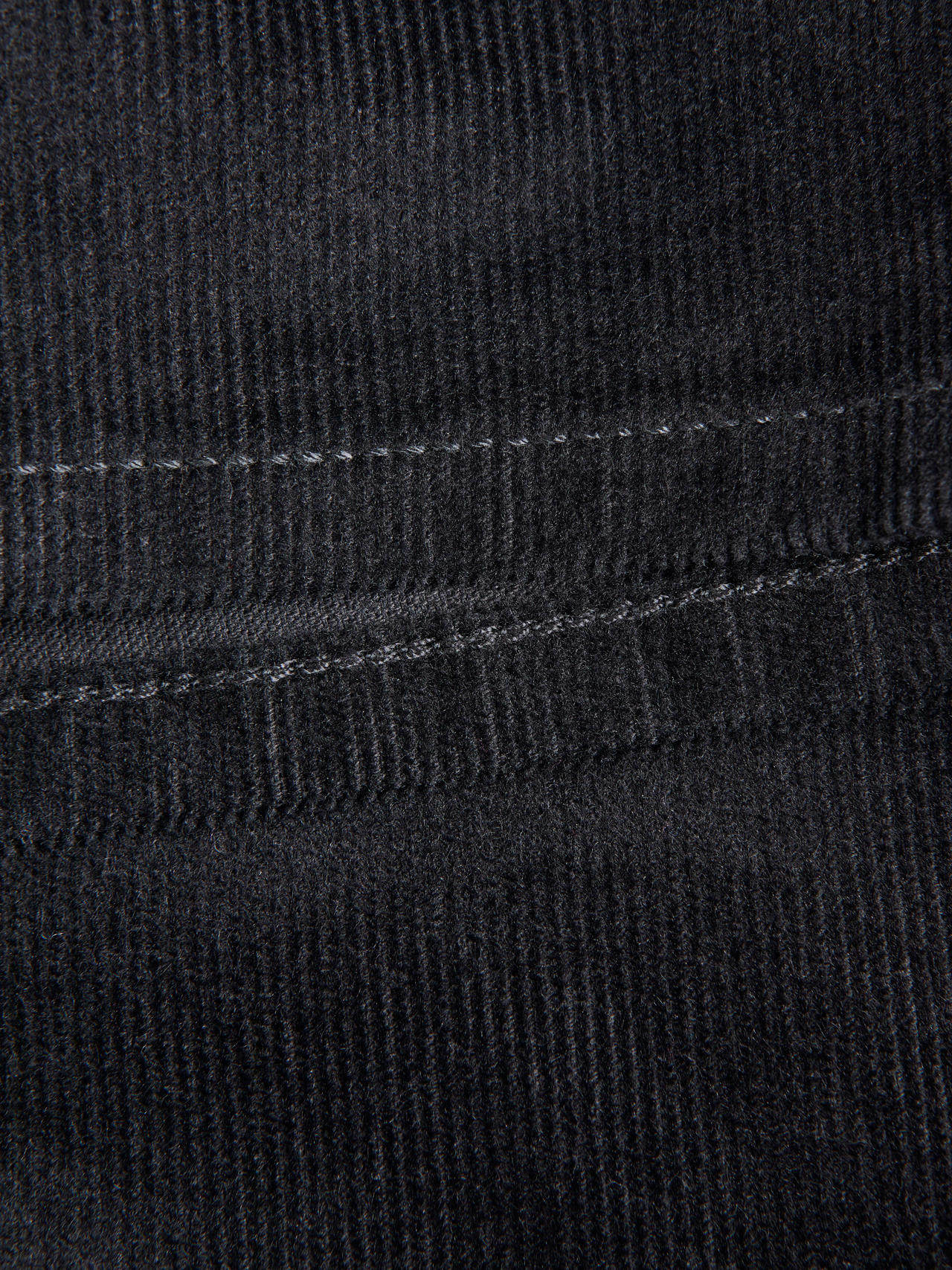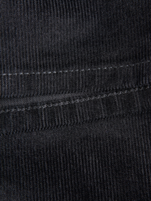 Corduroy is a ribbed, velvety fabric with a thick texture for warmth and volume.